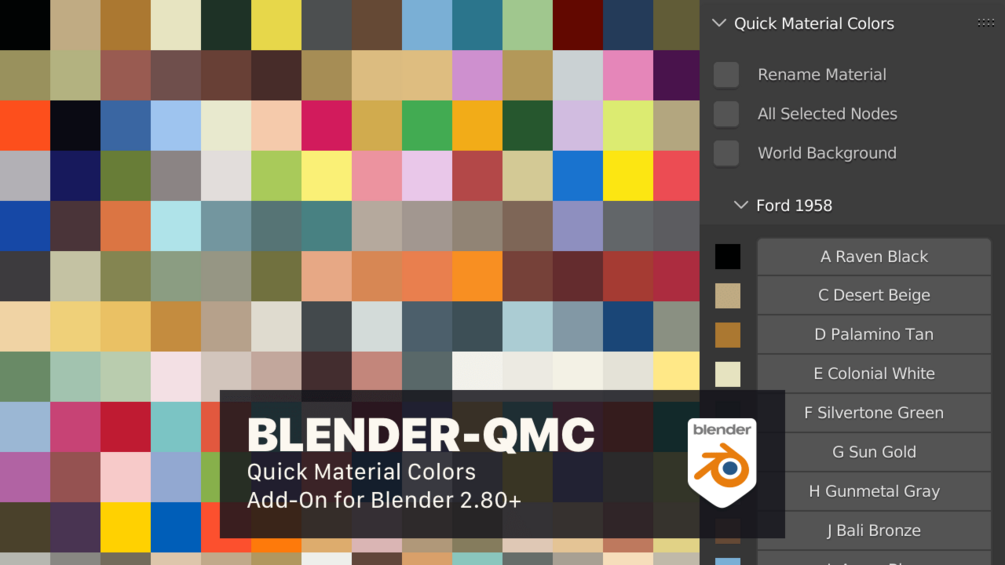 It also includes the Quick Material Colors collection – an add-on that assigns custom colors to a node's Base Color. 1,925+ colors for use on buildings, decorations, interior walls, automobiles, military equipment, appliances, and more.