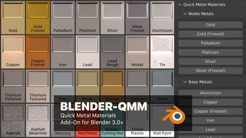 Blender QMM is a Blender 3.0+ add-on that installs a panel named Quick Metal Materials into 3D Viewport > Sidebar > MAT.